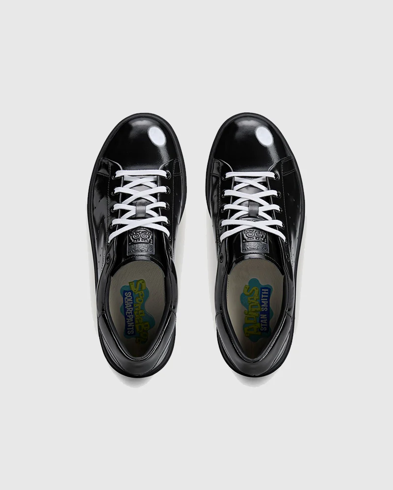 Pour le 25ème anniversaire de Bob l’éponge, Adidas met à l’honneur Bob et ses classiques chaussures noires avec sa tâche blanche. Le modèle est une Stan Smith revisitée chic et décalée sur du cuir vernis.