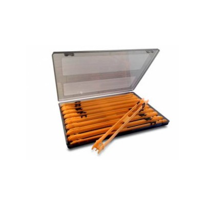 boite avec plioir preston 26cm double sliders Référence preston Chaque plioir est doté de deux curseurs en plastique permettant d’y accrocher deux lignes montées. La fente pour l’hameçon en forme de V est suffisamment fine pour accrocher un hameçon n° 26, Le curseur coulisse sur toute la longueur du plioir et ses deux pointes permettent de faire des tours dans n’importe quel sens. Longueur : 26 cm Couleur : orange Quantité : 9
