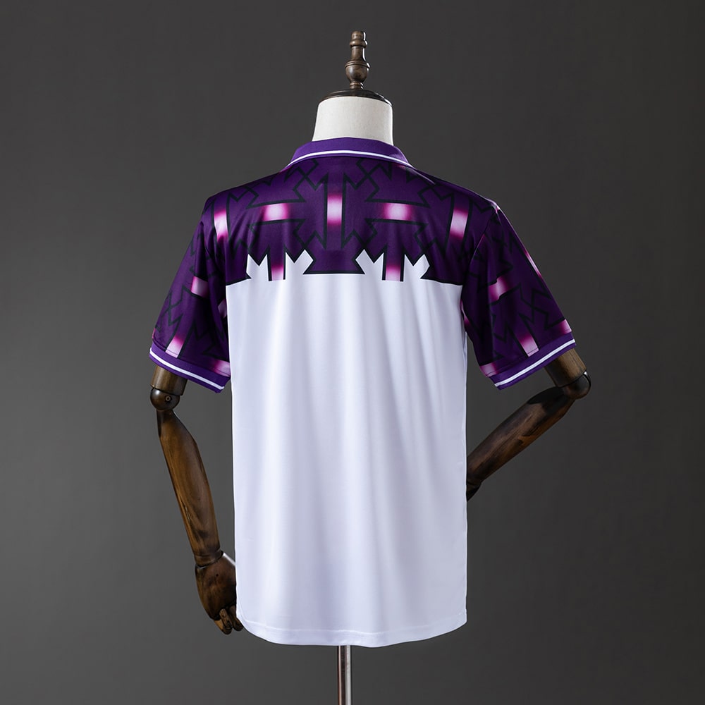 Le maillot retro vintage exterieur de la Fiorentina pour la saison 1992-1993 est une véritable icône du design footballistique des années 90. Créé par Lotto, il se distingue par ses motifs géométriques audacieux et son contraste saisissant entre le blanc et le violet, reflétant l’identité élégante et passionnée du club toscan.