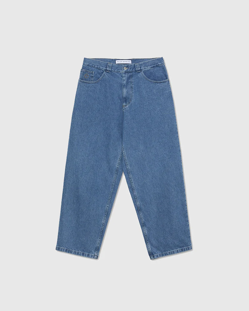 Colour: Mid Blue 100% Cotton Denim Fabric 435 gsm YKK Zipper Customised YKK Button Embroidery on Change Pocket Woven Label on Waist High Waisted Tapered Legs Baggy Fit