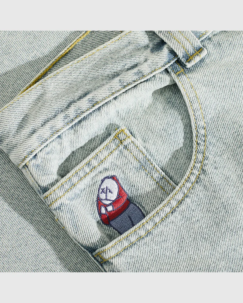 Light Blue 100% Cotton Denim Fabric 435 gsm YKK Zip Fly Embroidery on Change Pocket Woven Label on Waist Low Waist Tapered Legs Baggy Fit