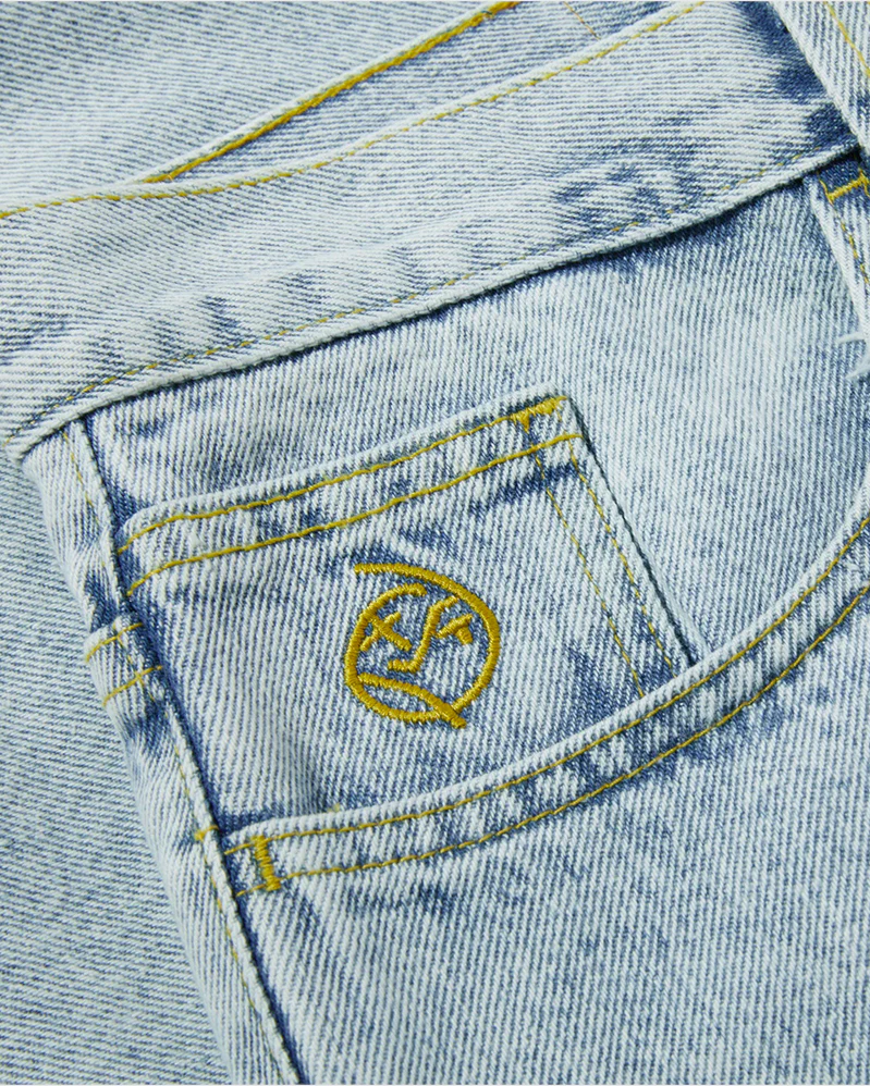 100% Cotton 435 gsm Denim Fabric YKK Zipper Customised YKK Button Embroidery on Change Pocket Woven Label on Waist High Waisted Baggy Fit Made in Poland