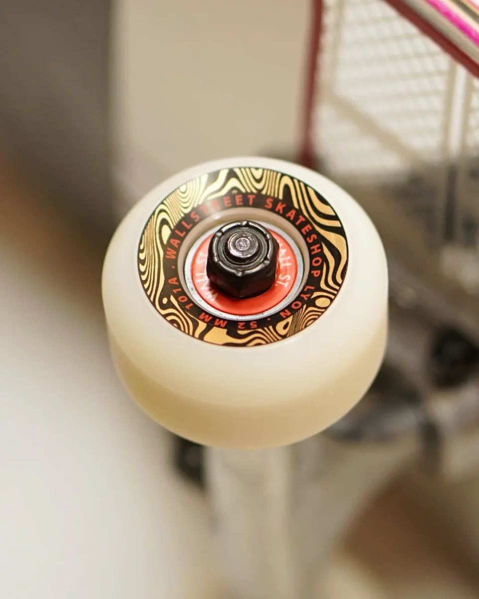 Roues : Wallstreet Wheels – disponibles en 53 mm ou 54 mm selon votre préférence.